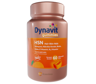 Dynavit® Gummies HSN Hair-Skin-Nails ürünü 60 adet portakal aromalı çiğnenebilir formdan oluşmaktadır.