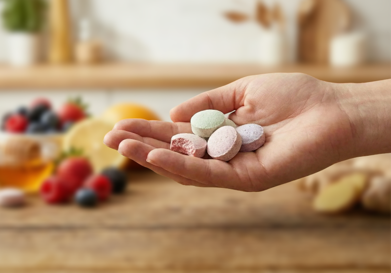 Çiğnenebilir formda üretilen takviye edici gıdalar, vitamin, mineral ve fonksiyonel içerikleri tablet veya kapsül yutmadan karşılamayı amaçlar.